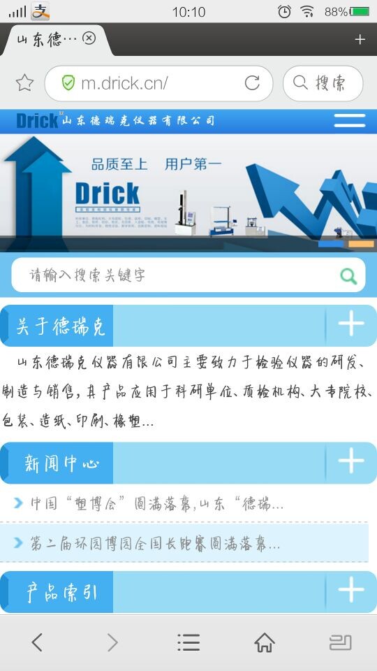 山東德瑞克作為引領創新技術的領導者,一直不斷的創造新技術,挖掘新技能,學習新知識;“不斷創新”貫穿著德瑞克公司的發展歷程。我們秉承“客戶滿意是我們永無止境的追求”的服務準則,為方便客戶更快速,更便捷的了解我們的產品,2015年新年伊始,特推出手機網站“m.drick.cn”“m.jndrktest.com”“m.worlddrick.com”供大家瀏覽,為全球客戶提供檢測儀器行業最新資訊,最新發展方向。